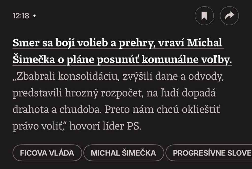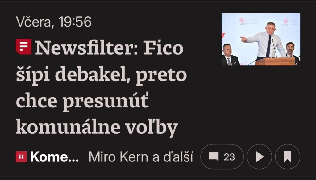 Zrejme o úplnú náhodu ide aj v nasledujúcom prípade. Včera zverejnil redaktor Denníka N Miro Kern (to je ten, ktorý sa priznal, že písal Šimečkovi, aby „neblbol“ a nevylučoval spoluprácu s OĽaNO, a neskôr svoje slová poprel) komentár, v ktorom tvrdí, že premiér Fico chce posunúť voľby do orgánov územnej samosprávy preto, lebo vraj tuší debakel. A dnes, čuduj sa svete, tie isté slová použil aj politicky nesvojprávny predseda PS Michal Šimečka: „Fico sa bojí volieb a prehry, preto chce posunúť voľby.“